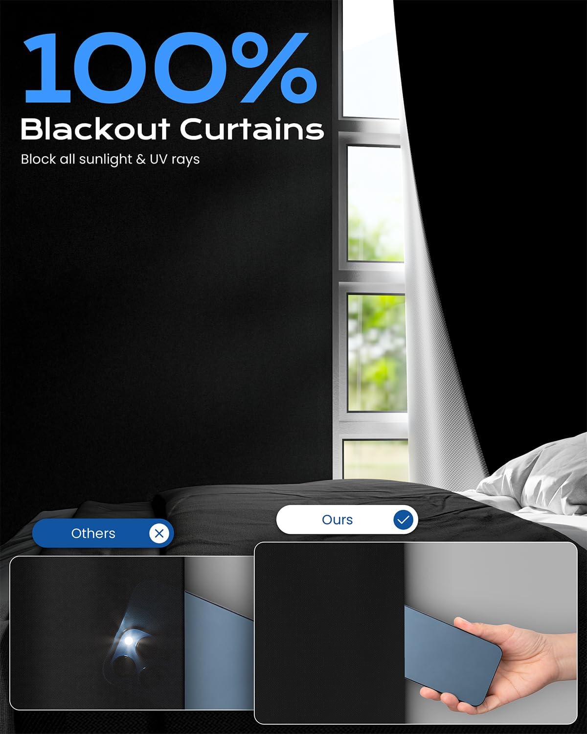 - [Superior Blackout Fabric]: portable blackout curtains, made of high-quality polyester fabric with TPU coating, can block 100% of sunlight,UV rays and create a cozy vibe for deep sleep. No burrs and waterproof, our black out curtains are easy to clean with damp cloth.