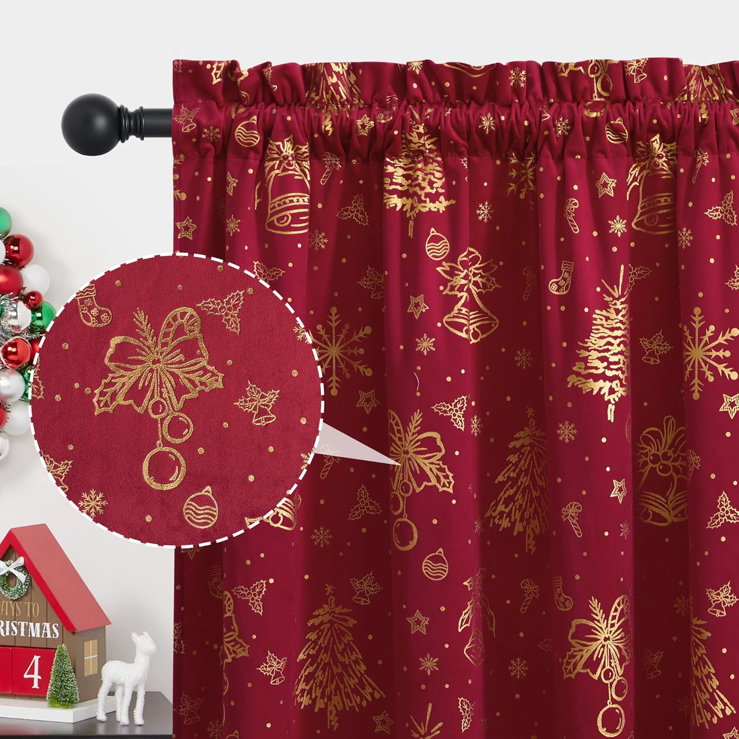 Christmas Curtains for Living Room Red Curtains 96 inches Velvet Foil Print Christmas Tree Bells Home Decor for Party Backdrops Bedroom Dining, W50 x L96 inches, 2 Panels