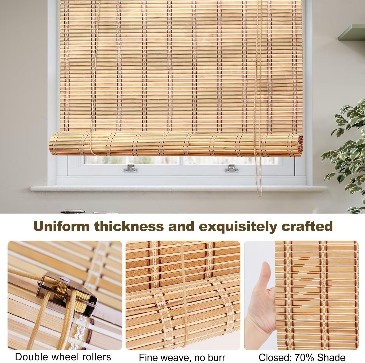 - Light Filtering:Designed with uniform thickness, meticulous workmanship, fine lines, and small gaps, our Bamboo Roll Up effectively filters sunlight and creates a soft, gentle light. Available in a variety of sizes to accommodate your needs, these Bamboo blinds are perfect for blocking out the sun’s rays or creating a cozy atmosphere.